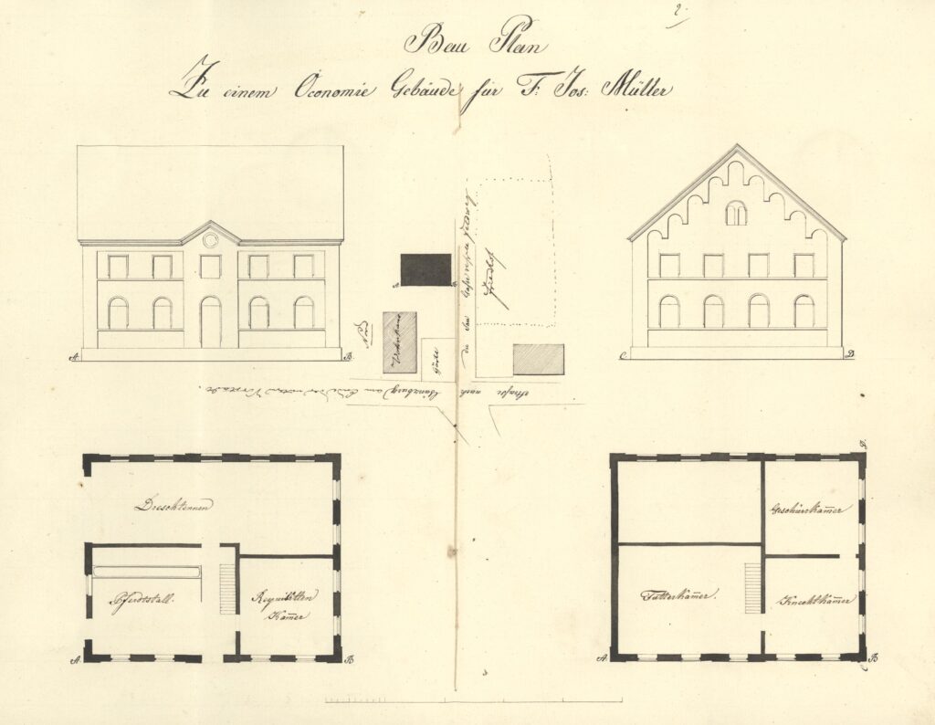Noch vor 1840 hatte der ‚Fornehmer‘1 Franz Josef Müller von Beuren (a.a.O. aus Meßhofen) das Haus Günzburger Str. 32 erworben und stellte 1840 Antrag auf den Bau eines Ökonomiegebäudes für das landwirtschaftliche Anwesen auf dem Nachbargrundstück. Ungewöhnlich ist die Ausführung des Ökonomiegebäudes, welches eher wie ein Wohnhaus als wie ein Nebengebäude aussieht. Der Bau wurde genehmigt und 1843 errichtet.