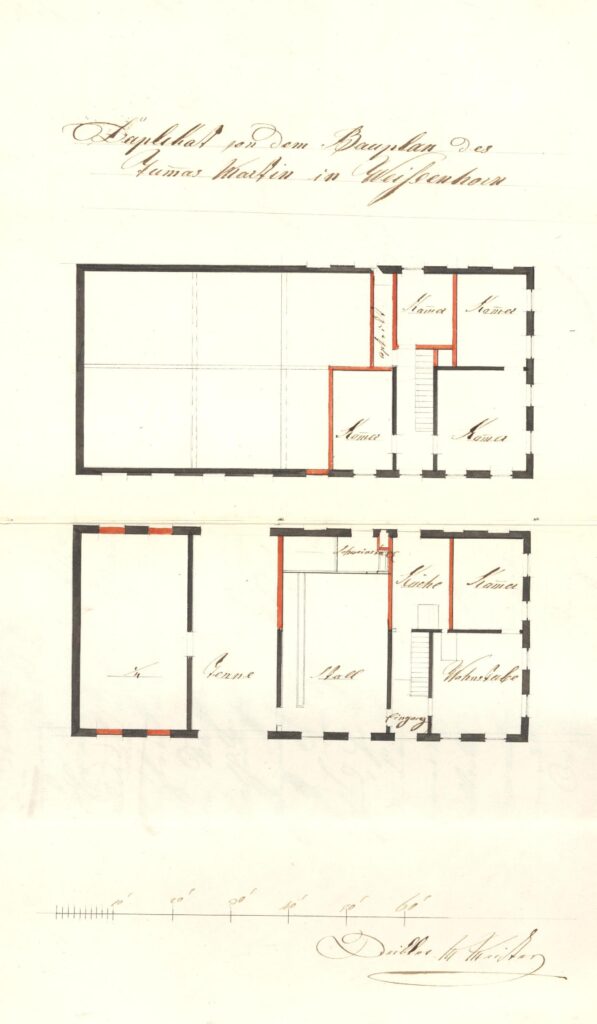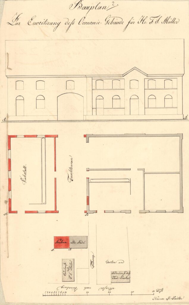 1845 möchte Müller das 1843 errichtete Ökonomiegebäude (A 123-M 11) um 30′ (8,75 m) nach Norden erweitern. Die Baukommission hatte zwar in baulicher Hinsicht keine Bedenken, bemerkte aber, dass das Gebäude zwar als Stadel genehmigt sei, aber so ausgeführt wurde, dass es sich mehr zu einem Wohngebäude eigne und so auch leicht umgebaut werden könnte. Miller habe als „Güterhändler“ (Makler?) offenbar die Absicht im Hinterhalt, die Polizeibehörde zu hintergehen und eine Ansiedlung vorzubereiten. Das LG Roggenburg sah als Genehmigungsbehörde keine Möglichkeit, den Bau zu verhindern.