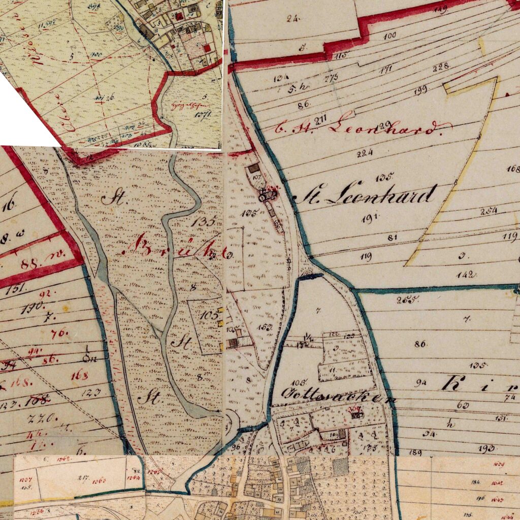 Ungefähr an der Stelle des heutigen Kreisverkehrs am Spitalweg befand sich laut Darstellung im Urkataster 1823 ein kleiner Tümpel. Dieser ist bis 1906 noch in den Katasterplänen eingetragen, bei der Neuvermessung 1921 aber nicht mehr. Vermutlich wurde er innerhalb dieses Zeitraums verfüllt. Hier befinden sich auch zwei Sühnekreuze, eines davon 1439 errichtet, ein Feldkreuz von 1878 und ein Bildstock von 1946.