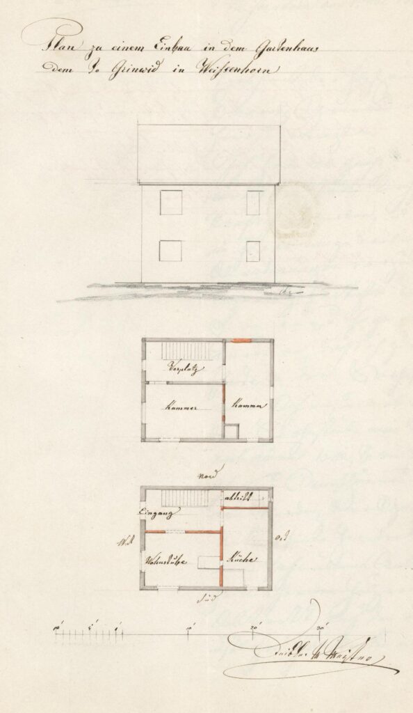 1863 hat der Holzhändler Moritz Grünwied das Gartenhaus 109/2 beim städt. Friedhof erworben und baut dies im Inneren um. Hierbei wird insbesondere der ehem. hölzerne Abtritt auf der Nordseite ins Innere verlegt. Die Genehmigung hierzu wurde am 19.05.1863 erteilt.