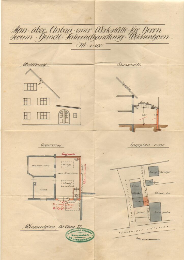 1922 steht der Mechaniker Severin Heindl im Adressbuch. Er baut eine Werkstätte an und betreibt eine mech. Werkstatt mit Fahrradhandlung.