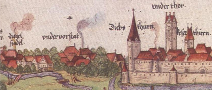 Hier befand sich die älteste Ziegelei der Stadt, genannt Ziegelstadel. Dieser Ziegelstadel ist auch schon auf der ältesten Stadtansicht aus dem Jahr 1555 an dieser Stelle eingetragen. Die auf der Zeichnung dargestellte Rauchfahne lässt darauf schließen, dass die Ziegel hier auch gebrannt und nicht nur gelagert wurden.