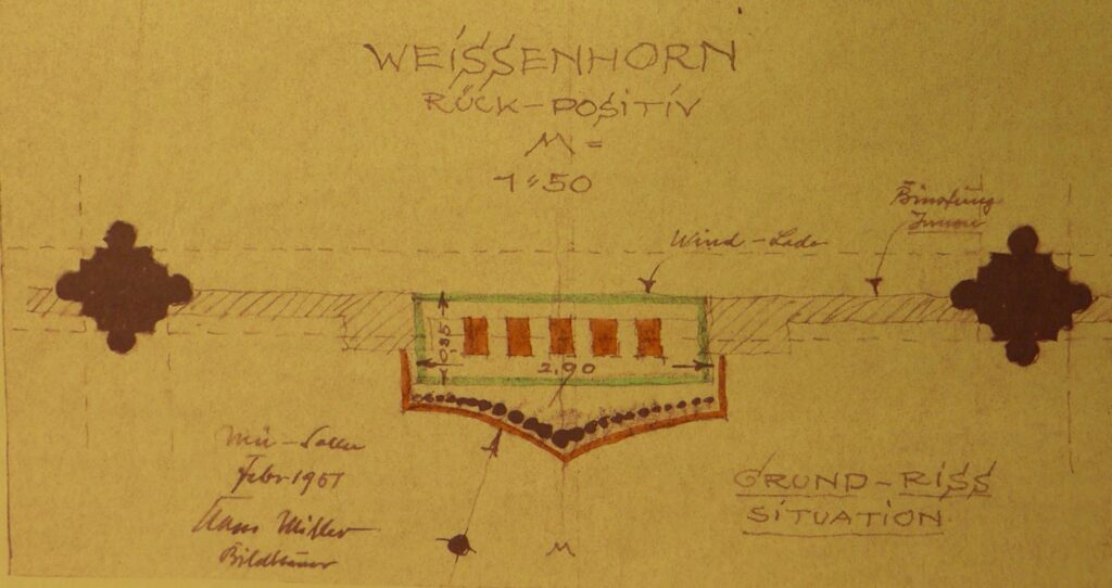 Der Orgelprospekt wurde von Bildhauer Hans Müller, München-Solln geschaffen. Im Stadtarchiv sind einige Entwurfsskizzen, datiert 1957, vorhanden.