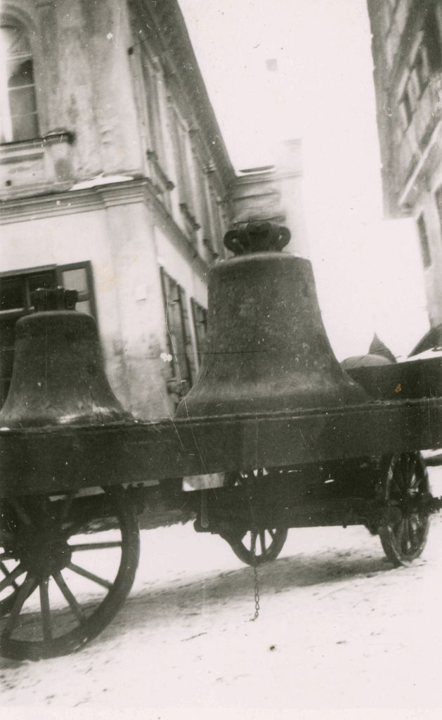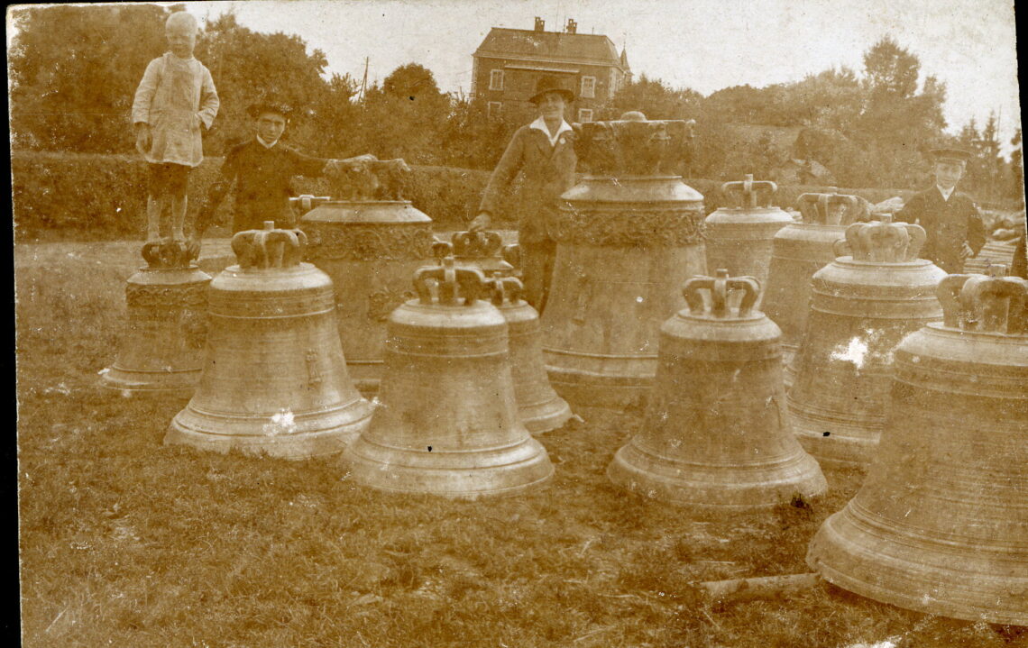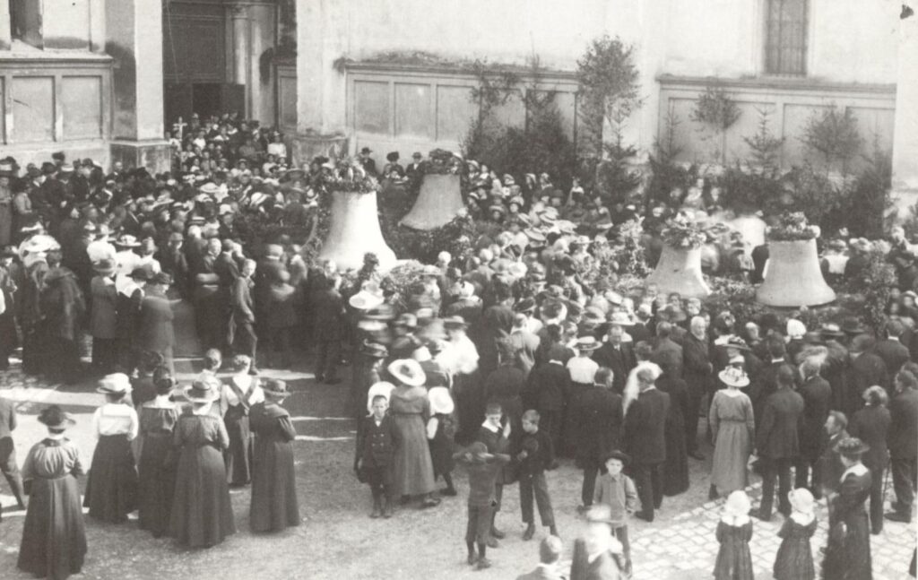 Zweieinhalb Monate vor dem Ende des I. Weltkriegs am 11.11.1918 wurden noch am 30.08.1818 die Glocken der Kirche konfisziert. Man hatte dies schon kommen sehen und bereits im Juni 1917 die Glocken von Werkmeistern abnehmen lassen. Zusammen mit anderen Glocken aus der Umgebung wurden diese zum Bahnhof gebracht und dort auf einen Flachwagen verladen. Der traurige Abschied wurde fotografiert.