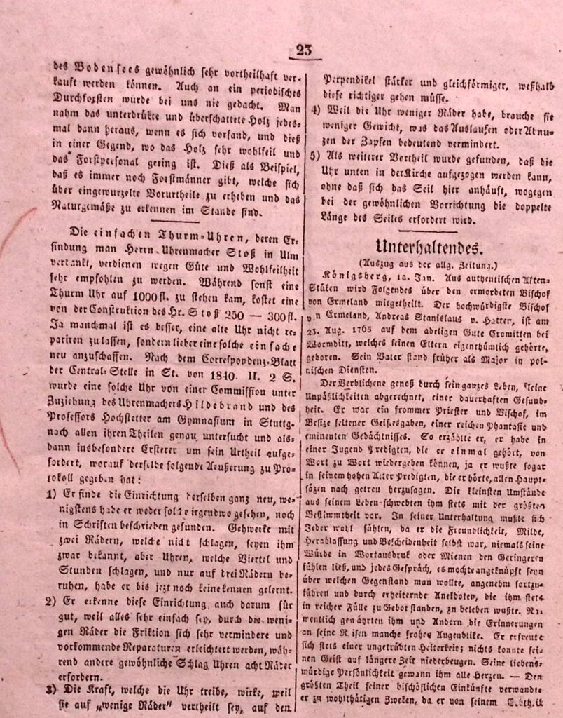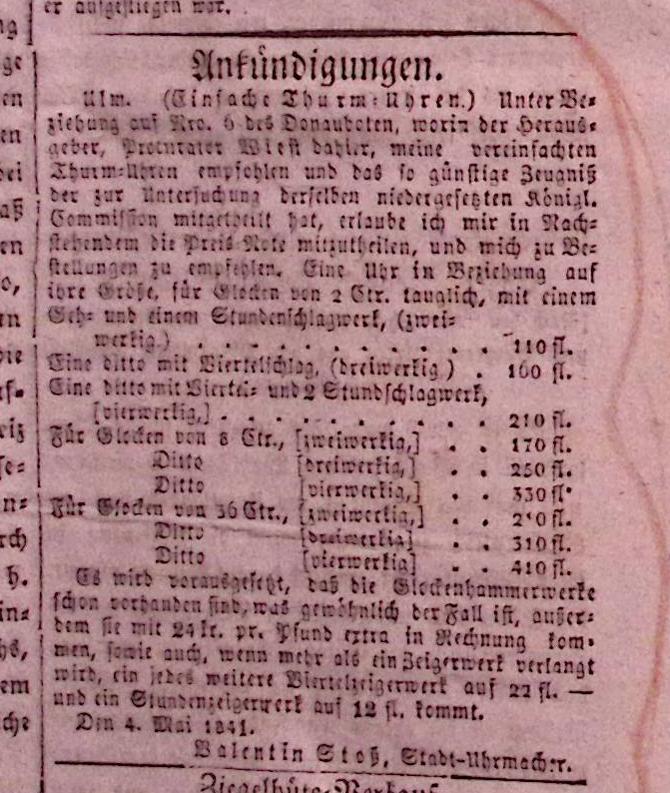 Im ‚Ulmer Donau Bote‘ vom 06.02.1841 wurde von einer neuartigen Uhr geschrieben und der Uhrmacher Stoß aus Ulm gab am 08.04.1841 eine entsprechende Anzeige auf.