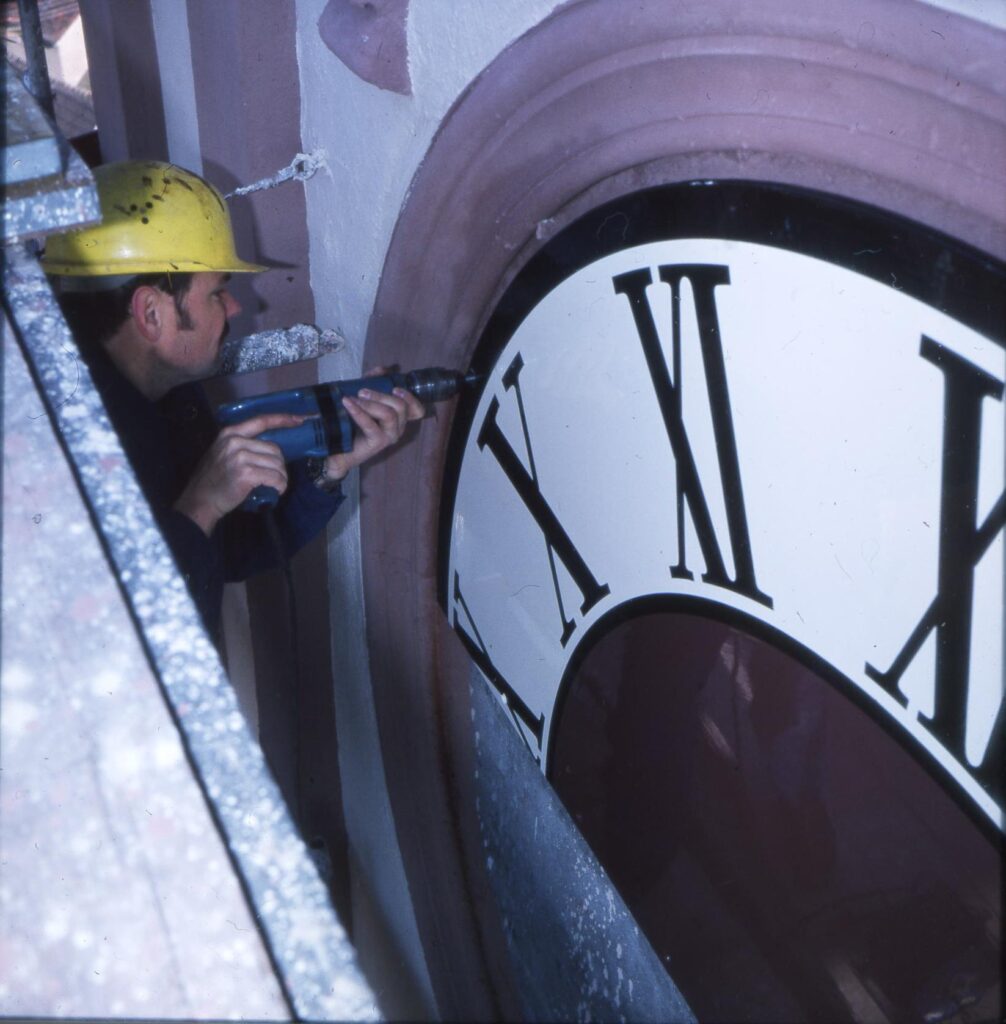 Auch für das Jahr 1812 ist eine Erneuerung des Ziffernblattes und der Zeiger im Rahmen der Erneuerung des Christophorus-Gemäldes am Turm verzeichnet.