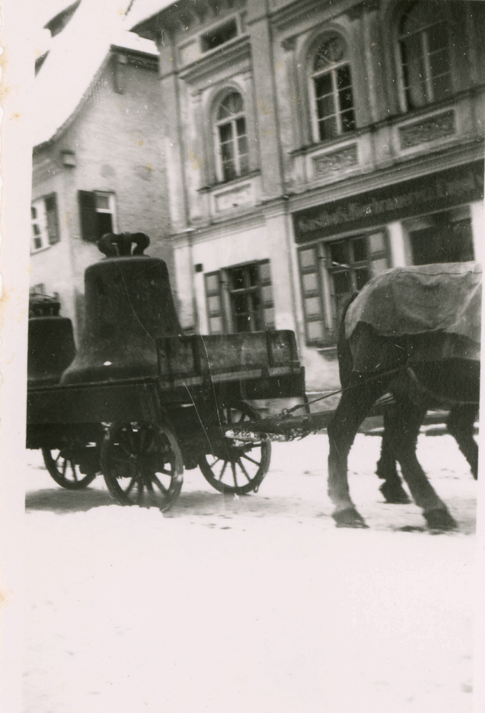 Im Jahr 1942 war es schon wieder so weit. Gerade einmal 23 Jahre waren den Glocken gegönnt, bevor der Staat wieder einmal Kirchenglocken als billiges Rohmaterial für Geschütze einforderte. Am 28.02.1942 mussten die Glocken abgenommen und abgeliefert werden. Vermutlich hat man zu diesem Zeitpunkt auch gleich den gusseisernen Brunnen vom Kirchplatz mitgenommen.