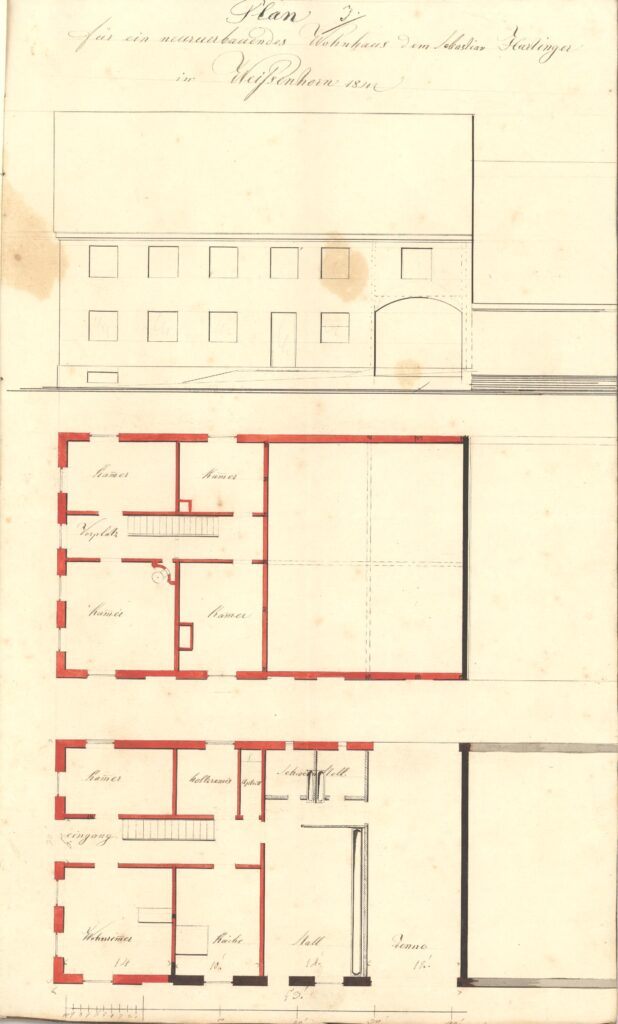 Am 14.08.1827 ging das Haus an den Gärtner Sebastian Hartinger. 1843 bricht dieser das bisherige eingeschossige Gebäude ab, baut ein neues zweigeschossiges Haus und verlängert es gleichzeitig um 15′ (4,36 m) nach Süden. Der Nachbar Maas (Rothweg 12) forderte die Neuerrichtung und Verwahrung der gemeinsamen Scheidewand, der gegenüberliegende Nachbar Gebhart erhob Einwände gegen das Stadeltor, weil beim Befahren des Tores sein Acker benachteiligt werde. Außerdem könne Vieh und Geflügel auf seinen Acker gelangen. Das LG Roggenburg empfahl eine gütliche Einigung. Beim Gütetermin am 04.03.1843 entsprach Hartinger den Wünschen seines Nachbarn Maas und verzichtete auf das Tor nach Westen, bestand aber auf seinem Abtritt auf dieser Seite. Gebhart gestand den Abtritt zu, forderte aber weitergehend, dass in Richtung zu seinem Acker keine Fenster angebracht werden dürfen, weil „durch dergleichen Öffnungen oder Kreutzstöcke sein Eigenthum mit Schaden bedroht werde, u. durch selbe aller Unrath ausgeschüttet werden könne„. Hartinger argumentierte, zwei dieser Fenster gingen auf seinen Acker zu und von den anderen entstehe kein Schaden. Gebhart bestand aber weiter auf seiner Meinung. Das LG Roggenburg erteilte Hartinger am 21.03.1843 die Baugenehmigung, drückte sich aber vor einer Entscheidung über die Frage der Fensterstöcke. Es erlaubte keine Fenster zum Acker des Gebhart und verwies hierzu auf den Rechtsweg. Daher stellt sich die Westansicht des Gebäudes bis heute relativ fensterlos dar. Die Verlängerung des Hauses wurde dann größer als geplant ausgeführt, sie lag bei ca. 6,30 m.