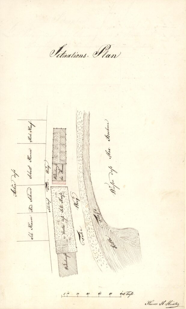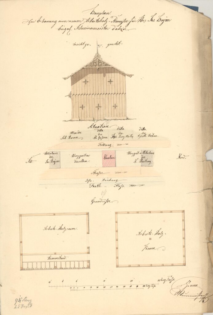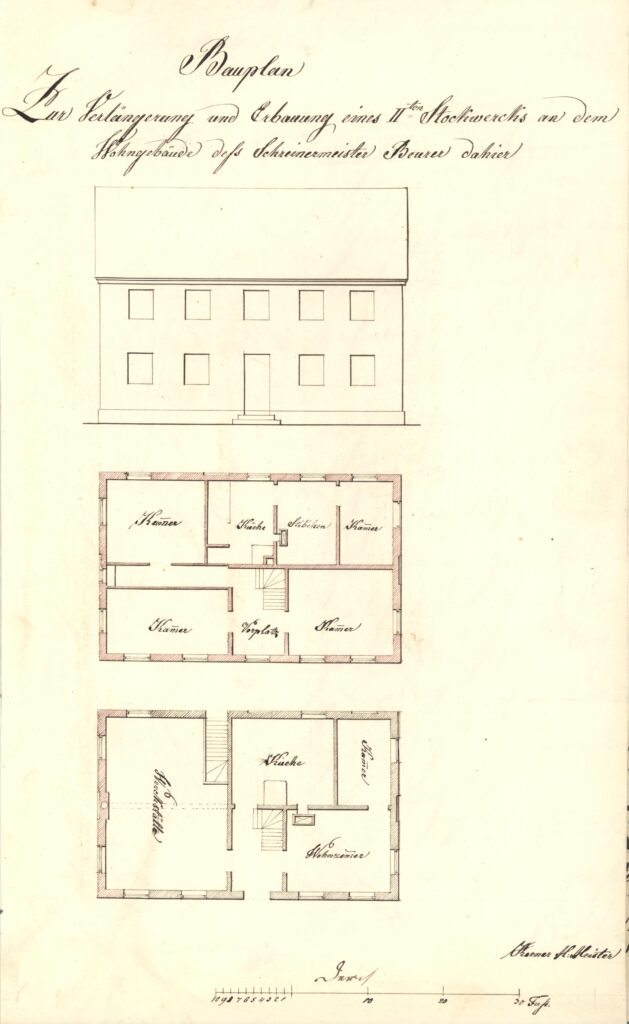 Der Schreiner und Bürstenbinder Joh. Weber stellt 1832 ein Gesuch zur Erbauung eines einstöckigen Hauses, weil er sein altes Haus verkauft habe, da er dieses nicht mehr bestreiten und auch sein Gewerbe nicht mehr ausüben könne. Mit dem nach Verkauf verbleibenden Vermögen möchte er ein neues Haus bauen und beantragt beim Magistrat die Überlassung eines Bauplatzes. Hierzu schlägt er einige Standorte vor. Der Stadtmagistrat findet keinen der vorgeschlagenen Plätze passend. Magistratsrat Math. Baur schlägt den ihm gehörenden Platz bei der sog. Herrschafts-Zimmerhütte bei Joh. Walters Wohnung auf den sog. Bollenplätzen vor. Weber reicht für diesen Platz einen Bauplan ein und erhält vom LG Roggenburg hierzu die Genehmigung. Johann Weber kauft den Platz am 29.09.1832.