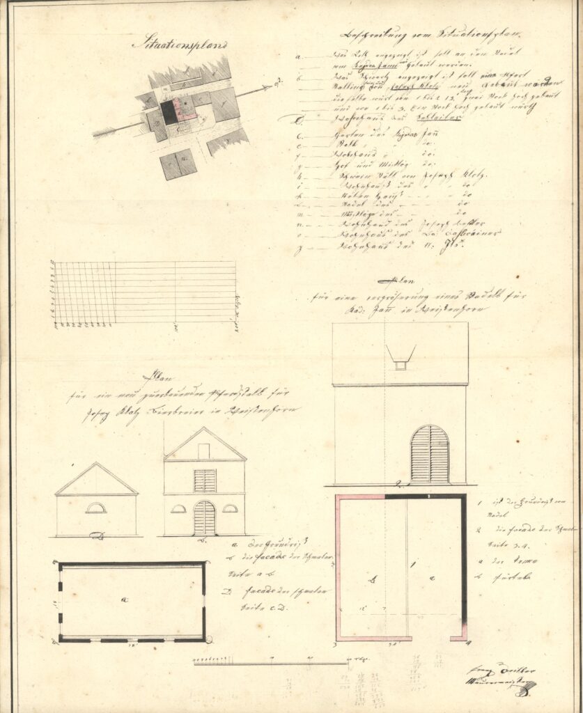 Jann vereinbarte daraufhin mit seinem Nachbarn Klotz einen Grundstückstausch, nach welchem er seinen Stadel nun so anordnen könne, dass Senleitner nicht mehr beeinträchtigt wäre. Klotz möchte auf dem getauschten Grundstück einen Pferdestall errichten. Jann legte eine neue Planung am 12.03.1834 vor. Senleitner hatte gegen den Stadel des Jann jetzt nichts mehr einzuwenden, wohl aber gegen den Stall des Klotz. Er reklamierte den Verlust der Aussicht und die Ausflüsse und Ausdünstungen aus dem geplanten Stall. Die städt. Baukommission gab nach Ortseinsicht der Meinung des Senleitner recht. Das LG Roggenburg sah den Stadel des Jann als genehmigungsfähig an, den Stall des Klotz jedoch nicht. Diese Entscheidung wurde den beiden Bauherren am 03.05.1834 bekannt gegeben.