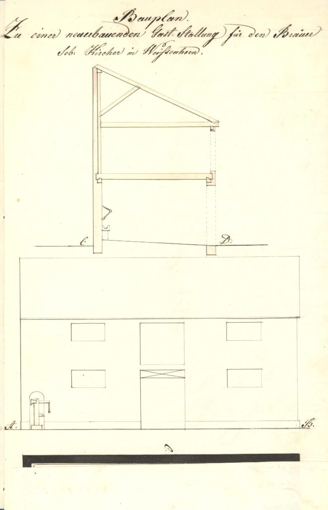 1854 beantragte der Engelwirt Sebastian Kircher, auf der Südseite seines Grundstücks, angrenzend an den Garten des Kajetan Jann, eine Gaststallung anzubauen. Dieses Grundstück hatte Kircher durch den Grundstückstausch 1834 bekommen. Die Nachbarn stimmten dem Bau unter der Voraussetzung zu, dass keine Fenster auf ihre Grundstücksseiten angebracht werden. Die Stallung wurde planabweichend nicht mit einem Pultdach, sondern einem Satteldach versehen.