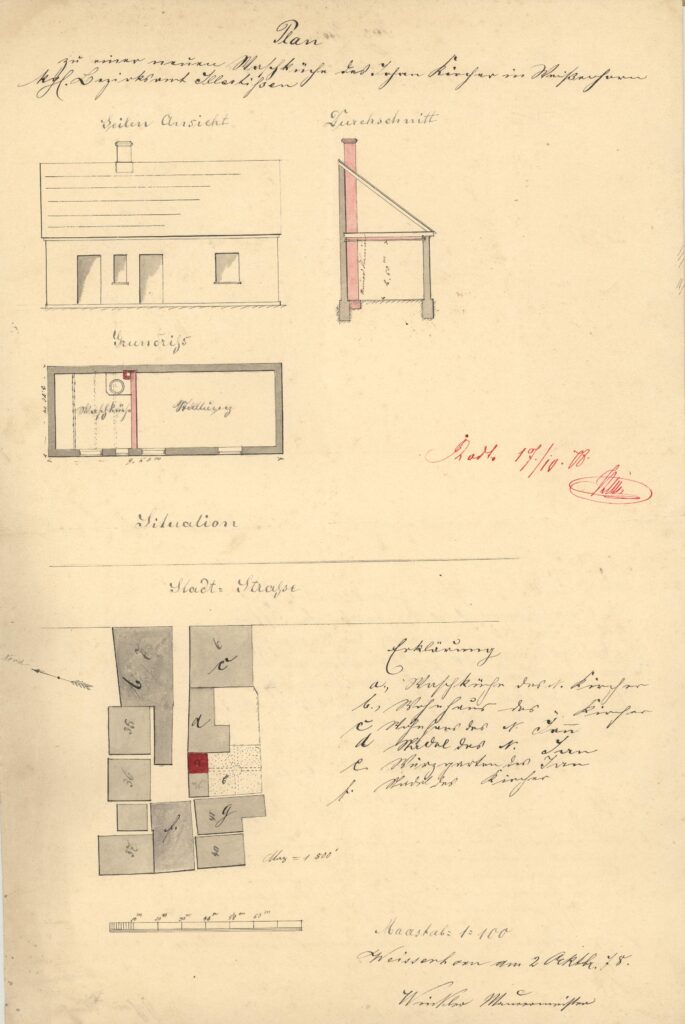 1878 stellte Johann Kircher einen Bauantrag, statt des Pferdestalls nun hier eine eingeschossige Waschküche zu bauen. Dieses Vorhaben wurde aber nicht realisiert.