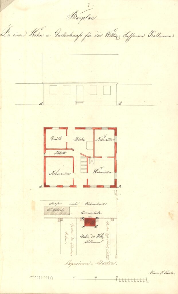 Die Gärtnerwitwe Susanna Kollmann hat 1844 ihr bürgerl. Anwesen Schulstr. 13 samt Garten verkauft und aus dem Kapuzinergarten 4 Teile erworben, die sie nun mit einem Wohnhaus bebauen möchte. Dieses käme auf die Kapuzinermauer im Norden zu liegen, nähme aber den Eingang nicht vom Zimmerplatz im Norden, sondern von Süden aus dem Garten heraus.