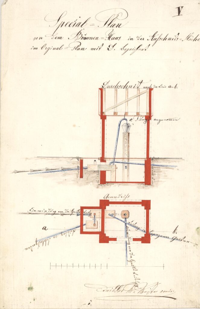 An der Einmündung der Oberhauser Str. in die Reichenbacher Str. befand sich bis zur Inbetriebnahme der Druckwasserleitung das sog. Wasserhaus. Die alte Laufwasserleitung aus dem Jahr 1538 floss einzig durch den hydrostatischen Druck in der Leitung. Da die verwendeten Holz- und Tonrohre aber besonders in den Muffen keinem hohen Druck standhielten, errichtete man hier ein Bauwerk zur Druckentlastung. Das Wasser wurde in einer Art Turm auf eine Höhe von ca. 3 m hochgeführt und offen in ein Auffangbecken geleitet, wodurch sich der Druck entspannte. Danach konnte sich für die Wasserversorgung der Brunnen und wenigen Einzelabnehmer wieder ein neuer hydrostatischer Druck von mind. 3 mWS aufbauen. Das Wasserhaus wurde nach Fertigstellung der neuen Wasserversorgung 1914 nicht mehr benötigt und abgebrochen.