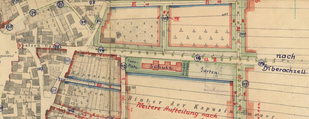 Bis zur Verwirklichung des Schulhausbaus 1960-1972 wurden die Grundstücke noch als Kleingärten genutzt. Die weitere Geschichte des Schulhausbaus wird in in einem eigenen Artikel behandelt.