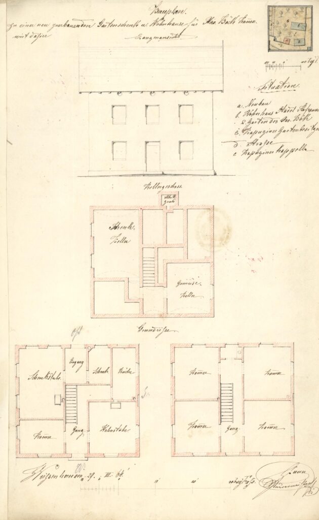 Im Jahr 1864 stellte Xaver Böck (damals noch wohnhaft in Reichenbacher Str. 4) hier einen Bauantrag für den Neubau eines Wohnhauses mit Gartenschenke, was auch in dieser Form genehmigt wird. Eigenartigerweise ist hier nichts von einem Einwand der Kapuzinergartenbesitzer zu lesen. Das Haus wurde vermutlich über einem alten Vorratskeller des ehemaligen Kapuzinerklosters errichtet. Größe des Kellers und Breite des Kellerzugangs stehen in keinem Verhältnis zur Größe und Art des Gebäudes. Beim Abbruch des Klosters 1812 wurde auch dieses Nebengebäude abgebrochen und so stand vermutlich hier auch keine Mauer des Klosters mehr, so dass die Kapuzinergartenbesitzer keinen Ansatzpunkt für einen Widerstand hatten.