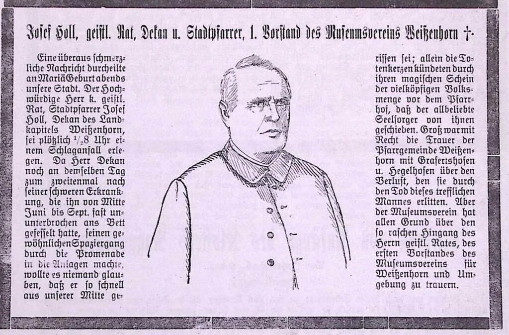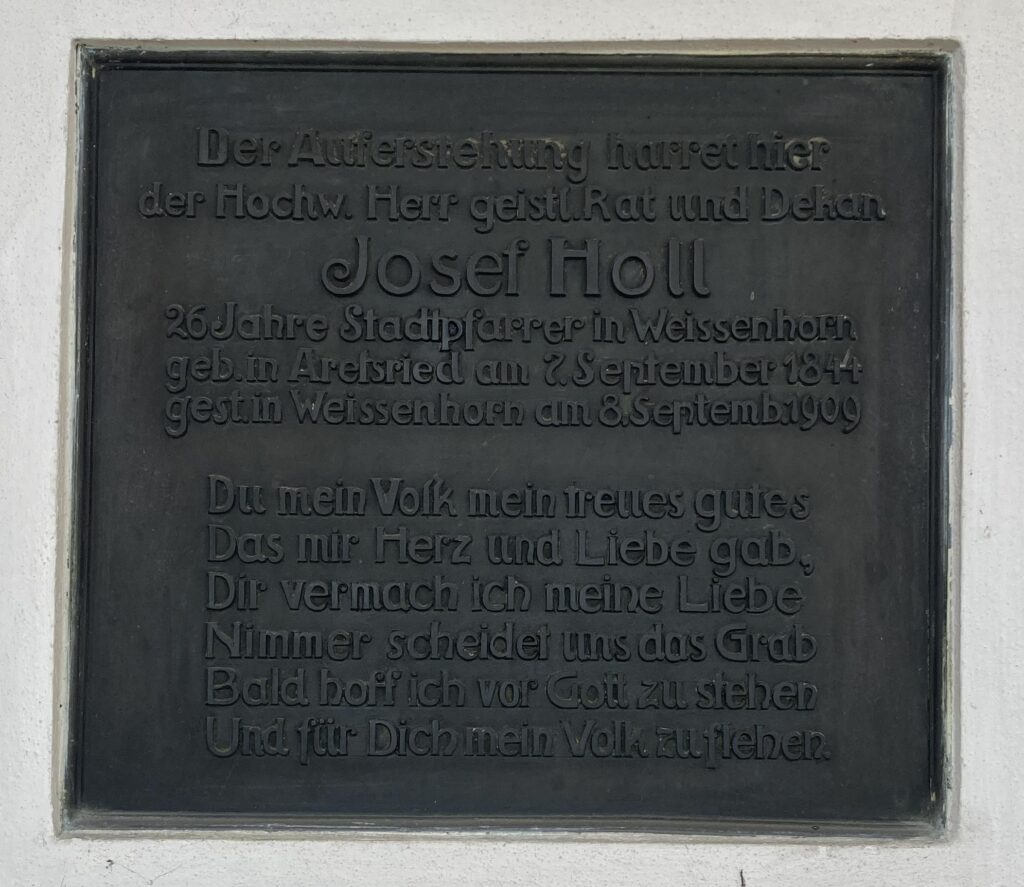 Josef Holl wurde am 07.09.1844 in Aretsried geboren. Ab 1868 war er Kaplan in Dinkelscherben, an 1869 bei St. Ulrich in Augsburg. Danach war er Pfarrvikar von Pfersee, Präfekt in Dillingen, Wallfahrtspriester in Friedberg und ab 1873 Pfarrvikar von Merching. 1877 wurde er Pfarrer in Hopferau bei Füssen. Seit 1883 war er Stadtpfarrer in Weißenhorn. Später wurde er auch Dekan. Er war heimatkundlich sehr interessiert und machte sich um die Erforschung der Stadtgeschichte verdient. Im Jahr 1904 veröffentlichte er eine Geschichte der Stadt Weißenhorn. Das Buch wurde 1983 vom Anton H. Konrad Verlag neu aufgelegt. Josef Holl starb am 08.09.1909 in Weißenhorn. Sein Epitaph befindet sich in der Friedhofskirche St. Bartholomäus auf dem Alten Friedhof.