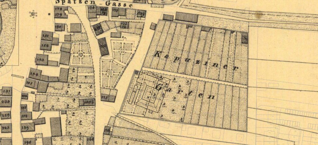 Die Fläche des ehemaligen Kapuzinerklosters wurde mit einem mittleren Erschließungsweg versehen und in Gartenflächen aufgeteilt. Die Klostermauer mit einer Höhe von ca. 6′ (1,75 m) blieb erhalten und war Gemeinschaftseigentum der Gartenbesitzer. Diese hatten dadurch einen festen Stand und wussten so eine Bebauung der Ostseite der Straße wirkungsvoll zu verhindern oder zumindest zu verzögern oder eine Ablösung auszuhandeln (siehe hierzu eigenen Beitrag).