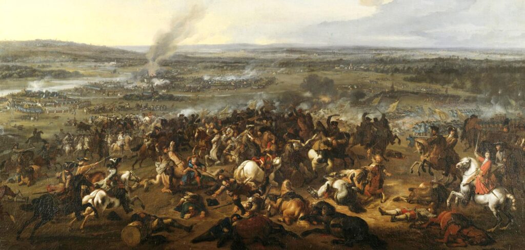 Der Spanische Erbfolgekrieg war ein dynastischer Konflikt um die spanische Thronfolge nach dem kinderlosen Tod Karls II., des letzten spanischen Habsburgers. Er eskalierte zu einem europaweiten Machtkampf zwischen Frankreich (Bourbonen), dem Heiligen Römischen Reich (Habsburger), England, den Niederlanden und Savoyen. Karl II. setzte im Testament den französischen Thronanwärter Philipp V. von Anjou (Enkel Ludwigs XIV.) als Erben ein, was eine Union Frankreichs und Spaniens mit dessen Kolonien ermöglicht hätte. Österreich, England und Niederlande befürchteten eine französische Hegemonie; Kaiser Leopold I. drängte seinen Sohn Erzherzog Karl als Kandidaten vor. Frankreich paktierte mit Bayern und stieß 1701/02 in Süddeutschland vor. Am 08.09.1702 nahmen die Bayern die Festung Ulm ein. Im Mai 1703 vereinigten sich die Bayern mit den Franzosen und siegten in der Schlacht zu Höchstädt am 20.09.1703. Die kaiserlichen und preußischen Truppen zogen sich nach Nördlingen zurück. Die Truppen bezogen in Schwaben Winterquartier. Am 13.08.1704 konnten die Alliierten unter Marlborough und Prinz Eugen in der Schlacht bei Blindheim einen klaren Sieg erringen.